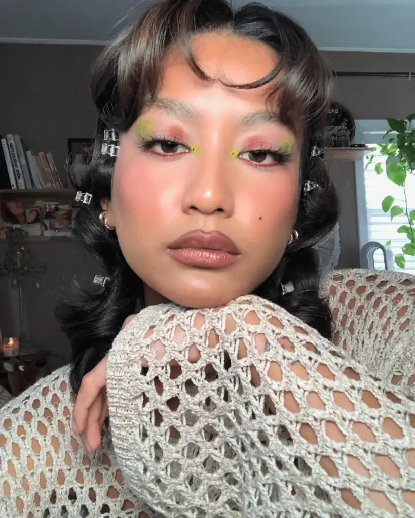 Rowisingh’s maximalist eye makeup looks just never miss! This look serves pure earth goddess energy with those electric lime green accents and pearl embellishments. The strategic placement of gold pearls along the brows and that glossy terracotta lip creates this stunning balance of ethereal and grounded vibes. The green drop earrings are the perfect compliment.