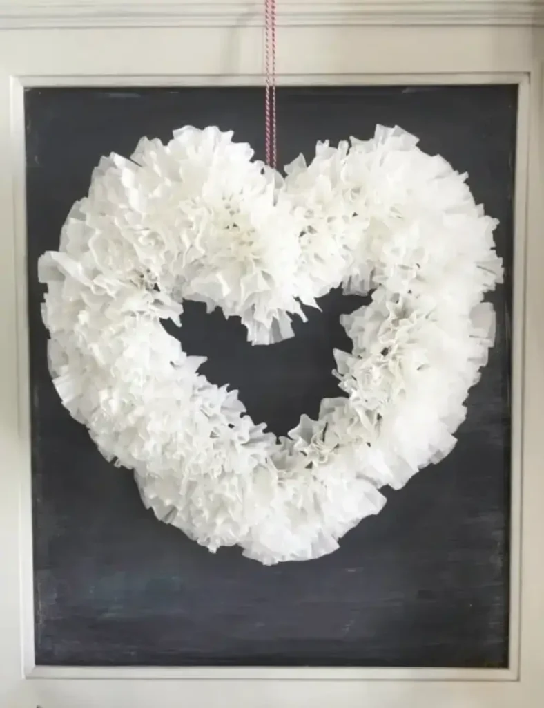 Elegant and timeless, this fluffy white wreath made from tissue paper is perfect for adding a soft, romantic touch to your Valentine’s Day decor.
